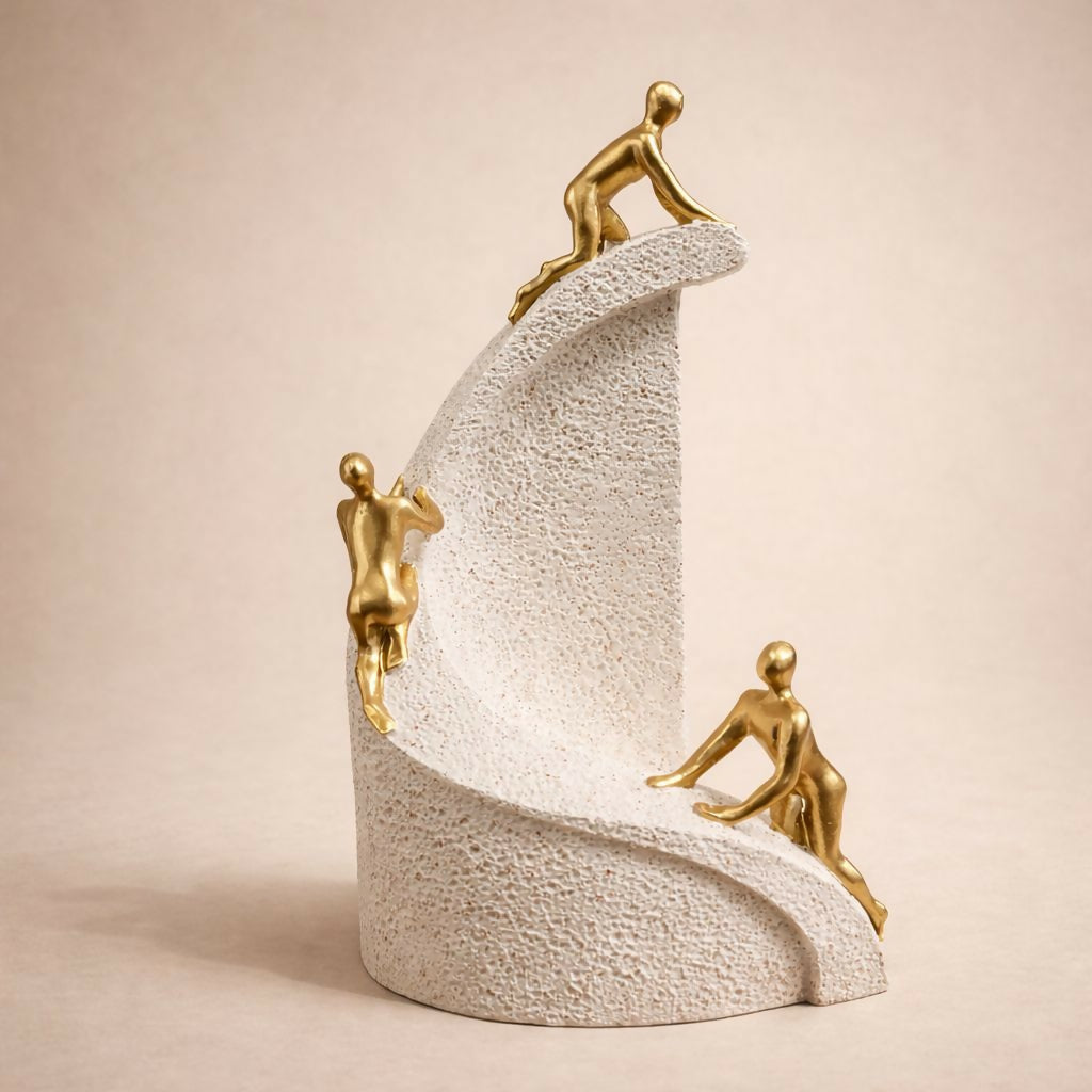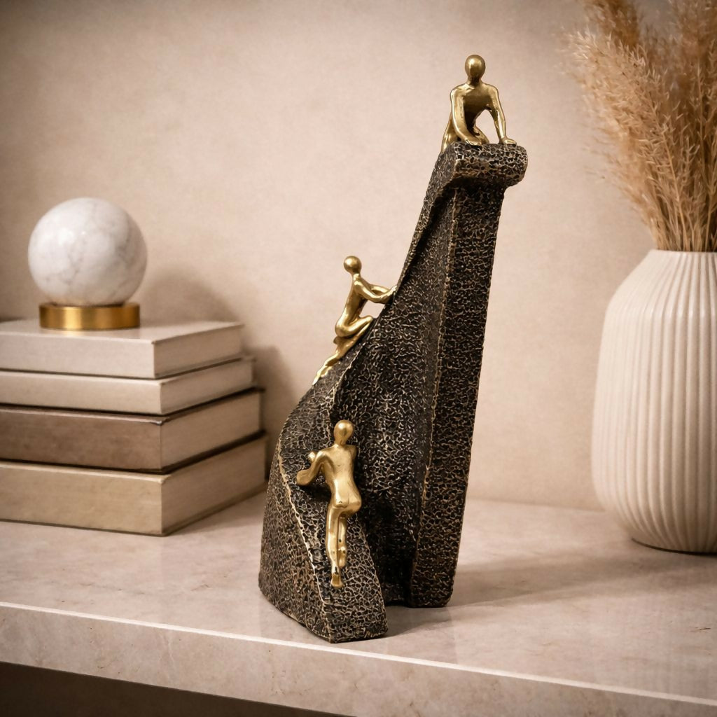 Add a meaningful artistic touch to your space with this abstract climbing human sculpture showpiece. Featuring three figures symbolizing growth, teamwork, and determination, this décor piece reflects motivation and progress. Crafted with a textured base and elegant metallic finish figures, it enhances modern interiors and serves as a thoughtful décor accent for homes and offices.