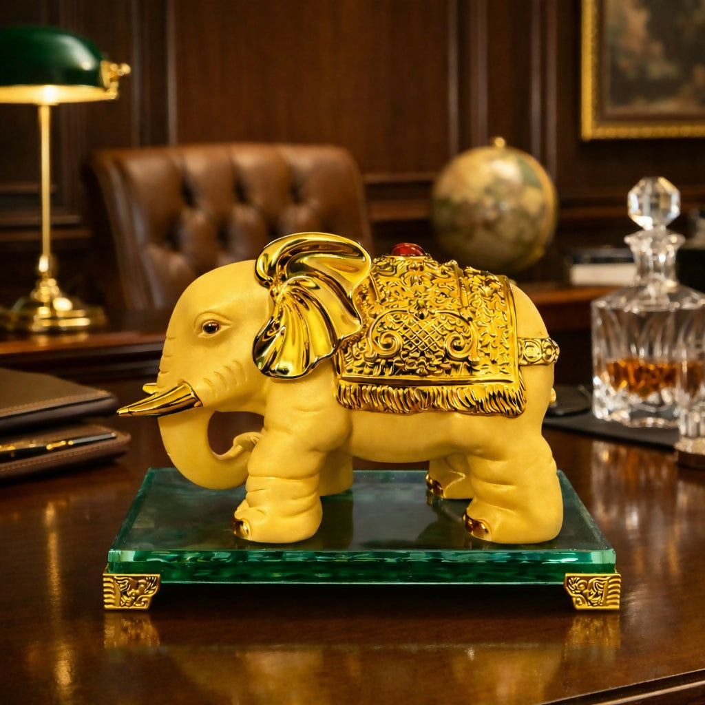 golden elephant showpiece, elephant decor statue, vastu elephant figurine, decorative elephant sculpture, luxury home decor statue, elephant idol for home, elephant tabletop decor, good luck elephant figurine, spiritual decor statue, pooja room decoration item, living room decor showpiece, elephant figurine for desk, vastu decor elephant statue