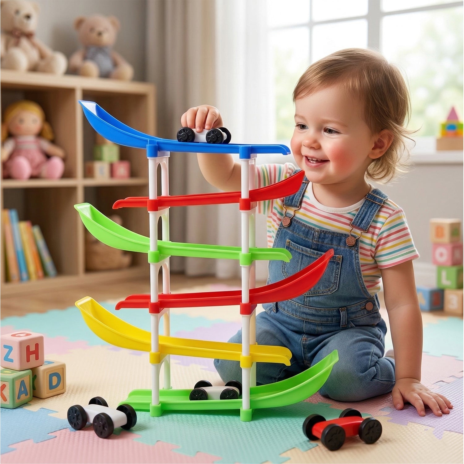 This multi-level car racing track toy set is designed to provide endless fun and excitement for kids. Featuring a colorful multi-tier ramp structure, it allows mini cars to slide down smoothly using gravity, creating a thrilling racing experience. The bright and attractive design captures children’s attention while helping develop hand-eye coordination and motor skills. Easy to assemble and safe for play, this toy encourages interactive learning and keeps children engaged for hours. Perfect for indoor play, it combines entertainment with early learning benefits.