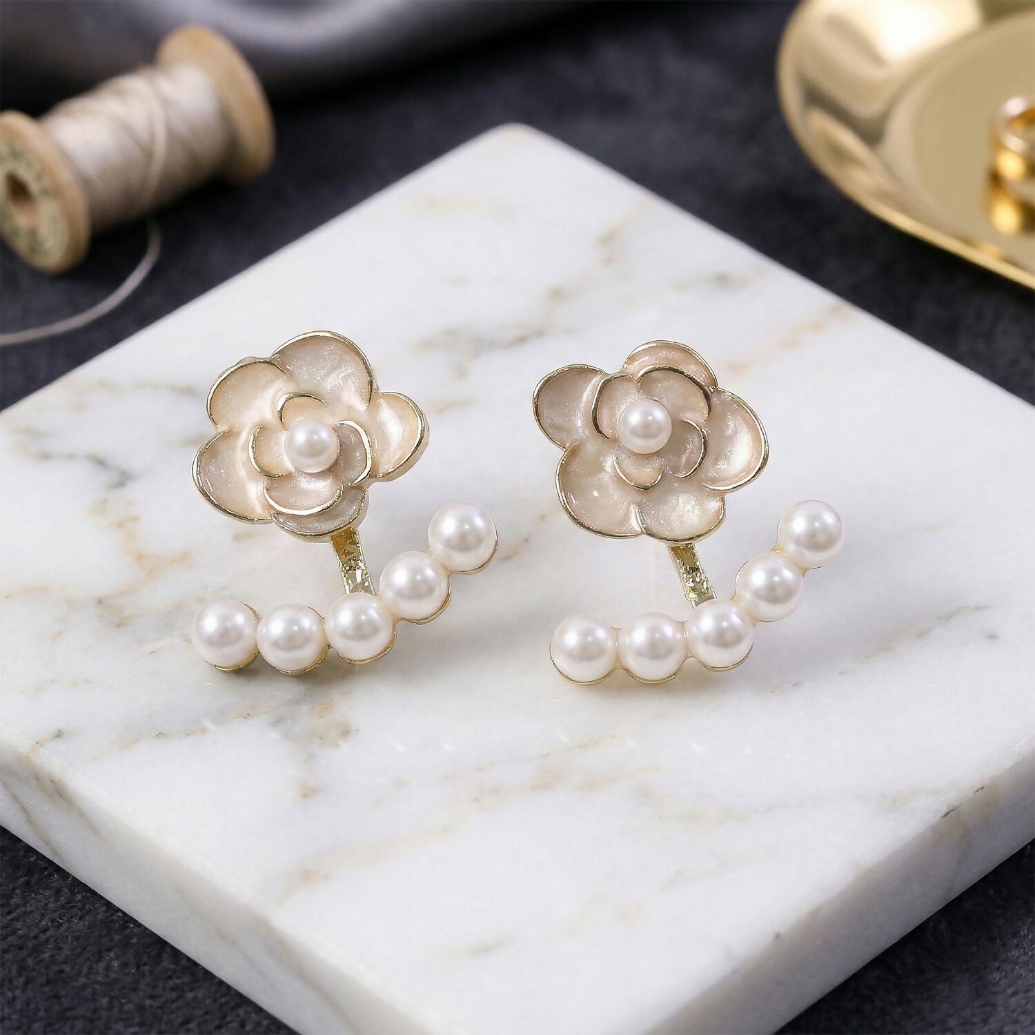 Design: These earrings feature a beautifully enameled white camellia rose as the main stud. Below the earlobe sits a curved “jacket” of five delicate pearls that follow the natural contour of your ear, creating a sophisticated and tiered look.