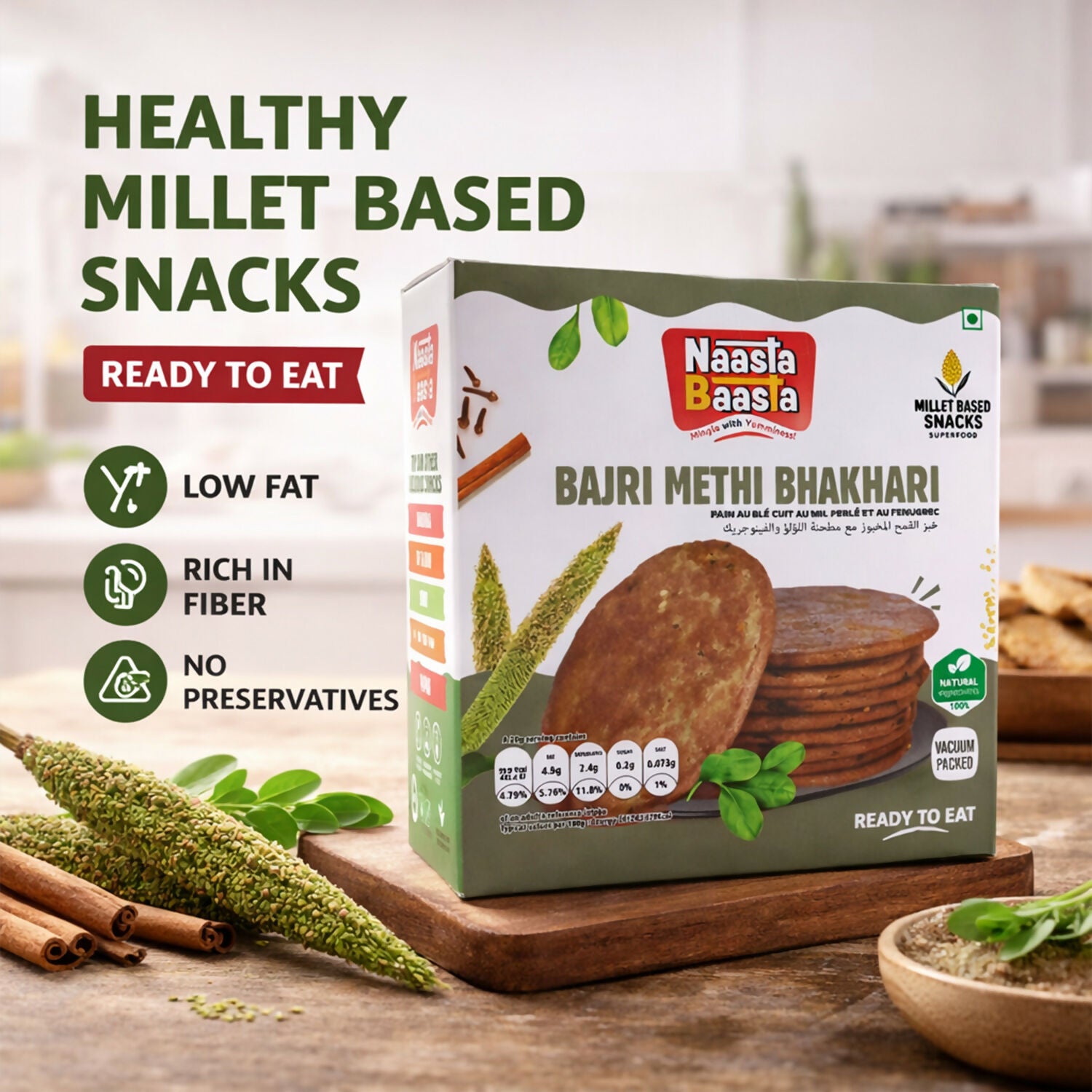 Enjoy the authentic taste of traditional snacks with Naasta Baasta Bajri Methi Bhakhari, a delicious millet-based ready-to-eat treat crafted for wholesome snacking.