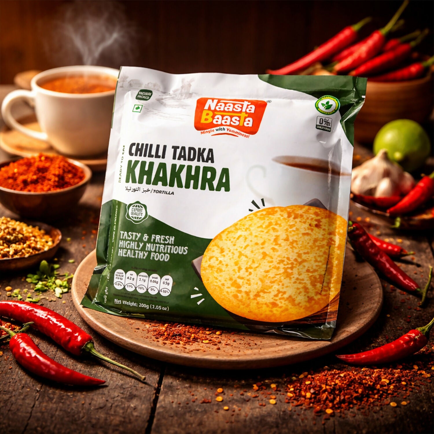 Naasta Baasta Chilli Tadka Khakhra is a ready to eat snack crafted for a tasty and fresh experience