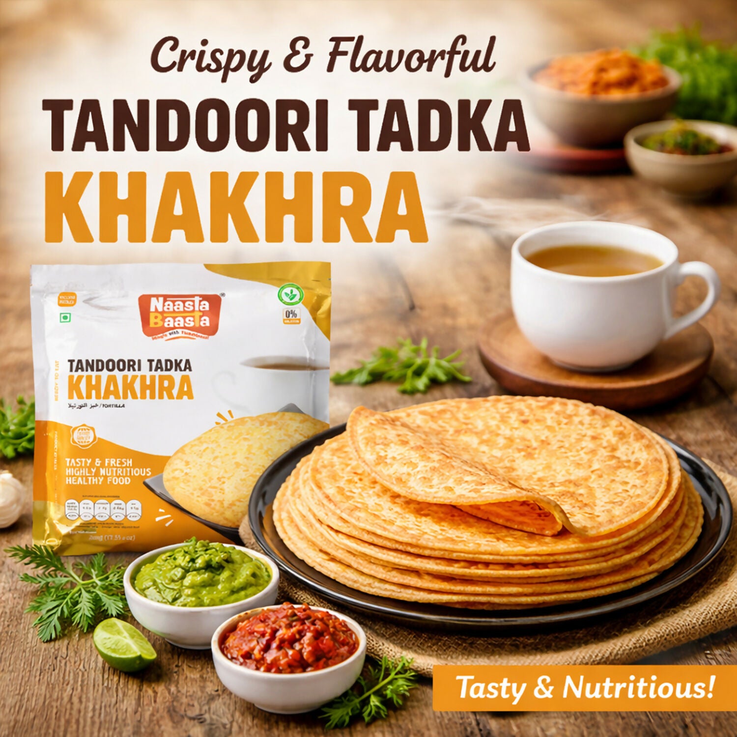 • Naasta Baasta Tandoori Tadka Khakhra pairs perfectly with tea, coffee, chutney, or dips for a complete snack experience