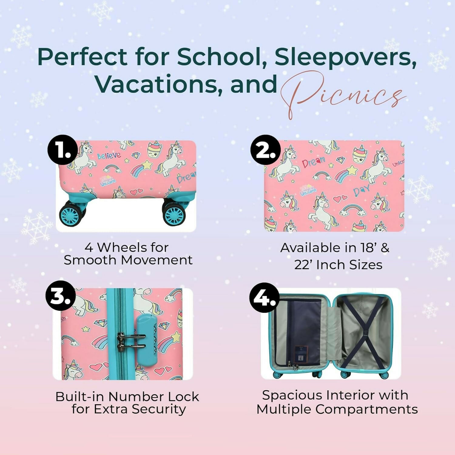 【SMOOTH MOBILITY】— Equipped with four 360° spinner wheels, this NOVEX trolley bag glides effortlessly through airports, hotels, and travel hubs. Its smooth-rolling design makes it easy for children to maneuver independently, providing a hassle-free travel experience. Lightweight yet sturdy, the bag ensures comfort and convenience while maintaining a playful, magical style that kids love.