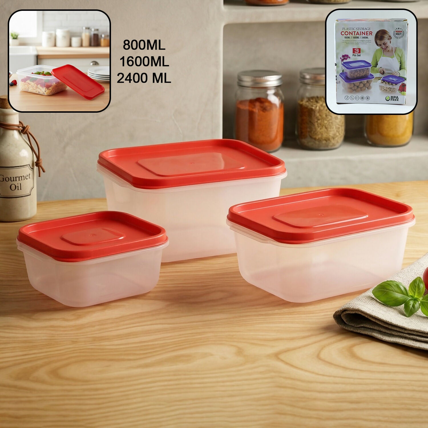 Plastic Food Storage Container Set – 3 Pieces Kitchen Storage Box Set (800 ml, 1600 ml, 2400 ml)