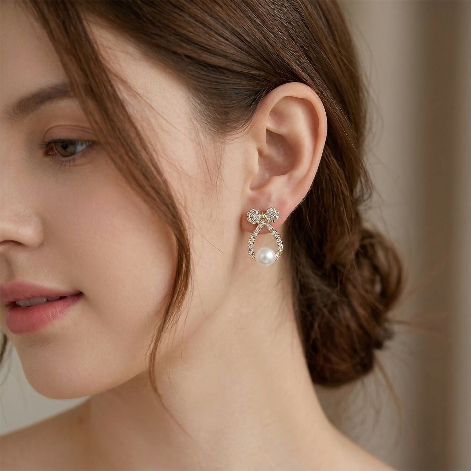 Premium Korean Crystal Bow & Pearl Drop Stud Earrings