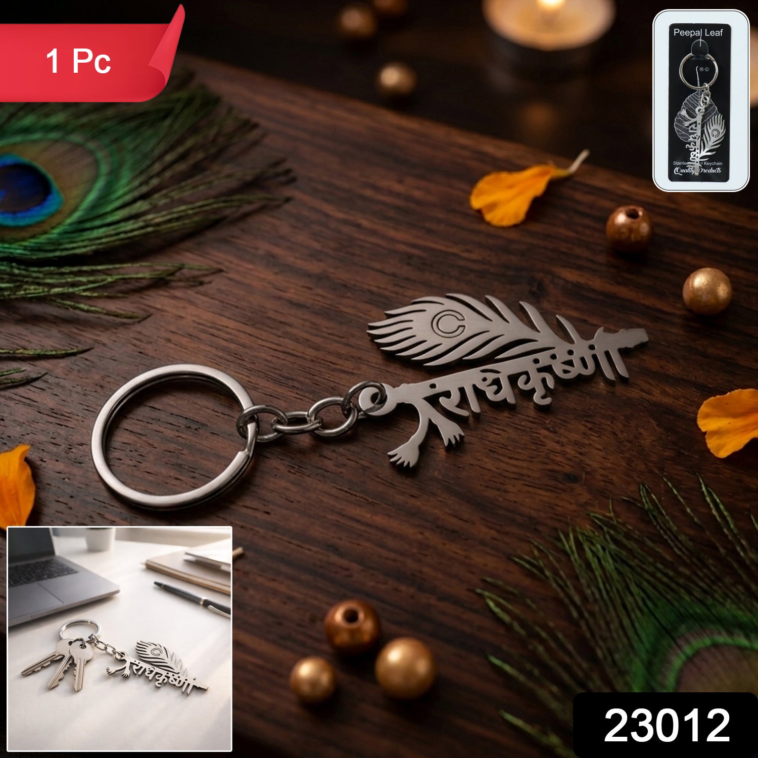 Premium Metal Radhe Krishna Keychain 1 Pc – Stylish Peacock Feather Design Lord Krishna Engraved Durable Key Ring for Car, Bike