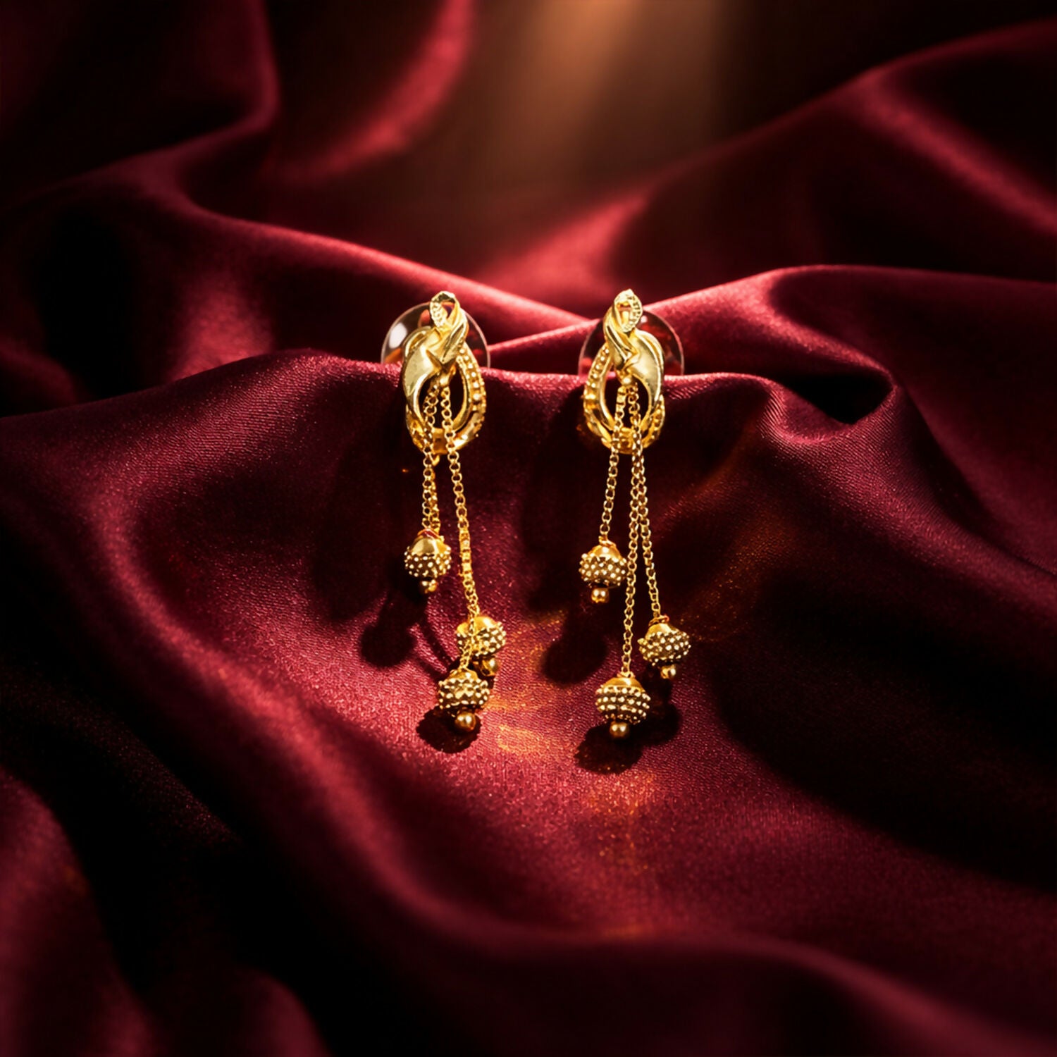 The polished gold finish enhances every detail of the earrings, giving them a radiant glow that complements both traditional and modern styles. Whether worn with ethnic outfits such as sarees, lehengas, or salwar suits, or paired with contemporary dresses for parties and formal events, these earrings add a sophisticated finishing touch to any look.