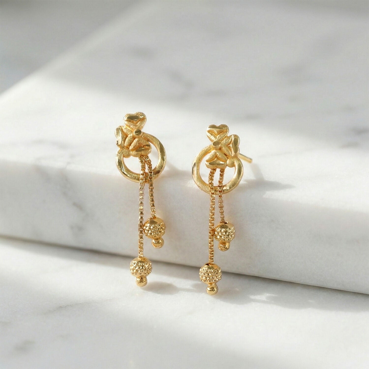 From the heart-shaped centerpiece, three fine gold chains gently cascade downward, each ending with textured gold bead drops that add subtle shine and movement. These delicate dangling elements catch the light beautifully, creating a soft shimmer with every turn of your head. The balanced design ensures the earrings feel lightweight while still making a refined statement.