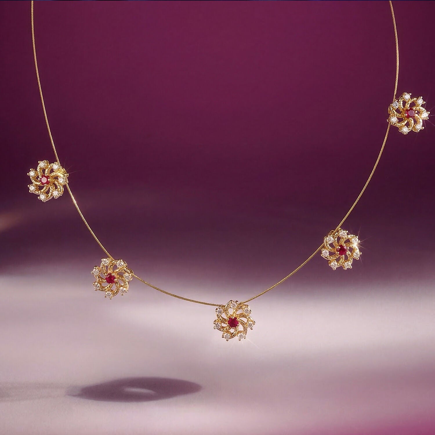 Ruby Floral Station Necklace with Diamond Detailing and Elegant Gold Chain Design