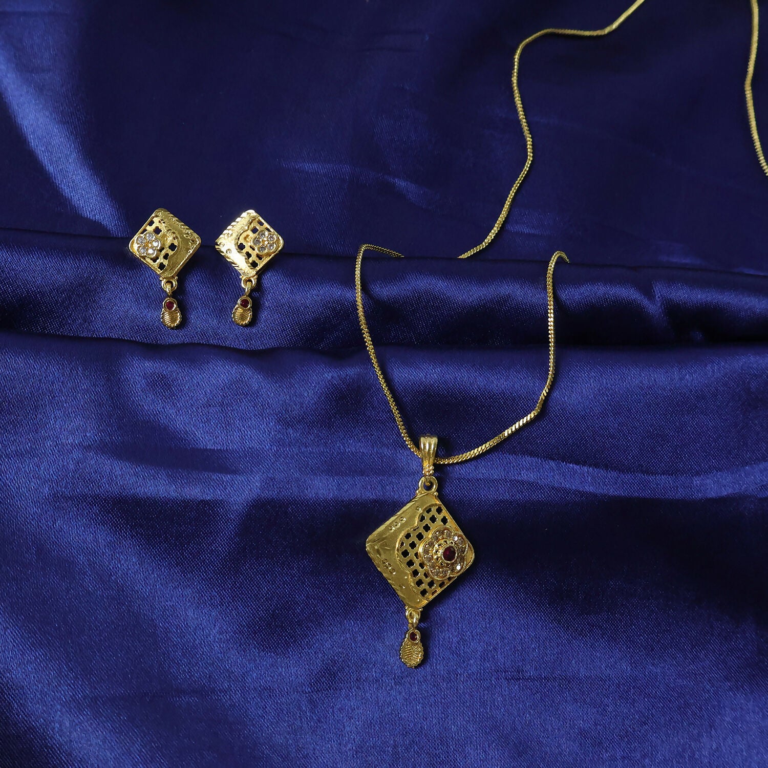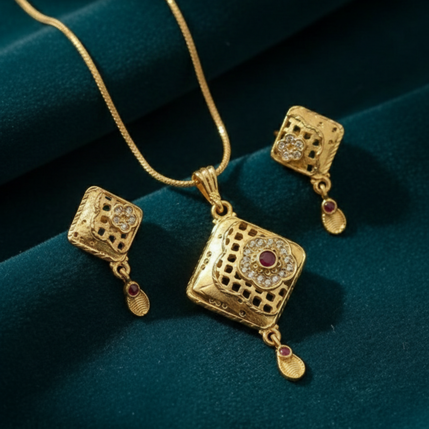 ચોરસ પેટર્નવાળા પેન્ડન્ટ અને મેચિંગ ઇયરિંગ્સ સાથેનો ભવ્ય સોનાનો દાગીનાનો સેટ, જે ફ્લોરલ સ્ટોન ડિટેલિંગ અને રૂબી-ટોન ડ્રોપ્સથી શણગારેલો છે. ઉત્સવ અને પરંપરાગત વસ્ત્રો માટે યોગ્ય.