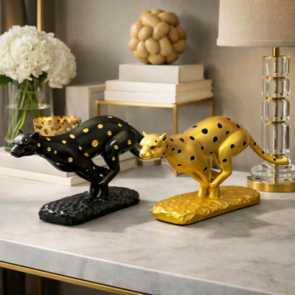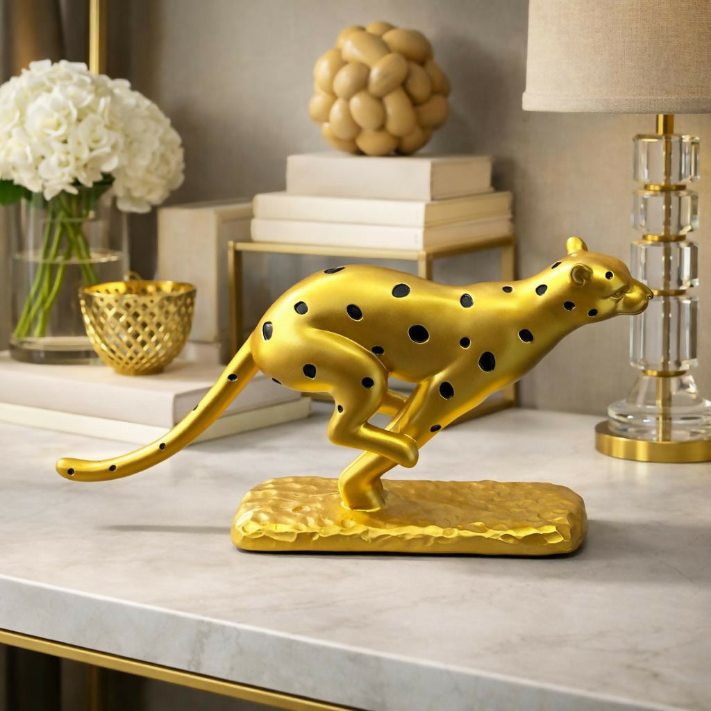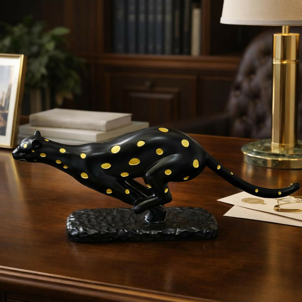 leopard showpiece, animal statue, decorative sculpture, tabletop decor, home decor item, office desk decor, modern decor, luxury decor, running animal figurine, shelf decor, artistic showpiece, gift item