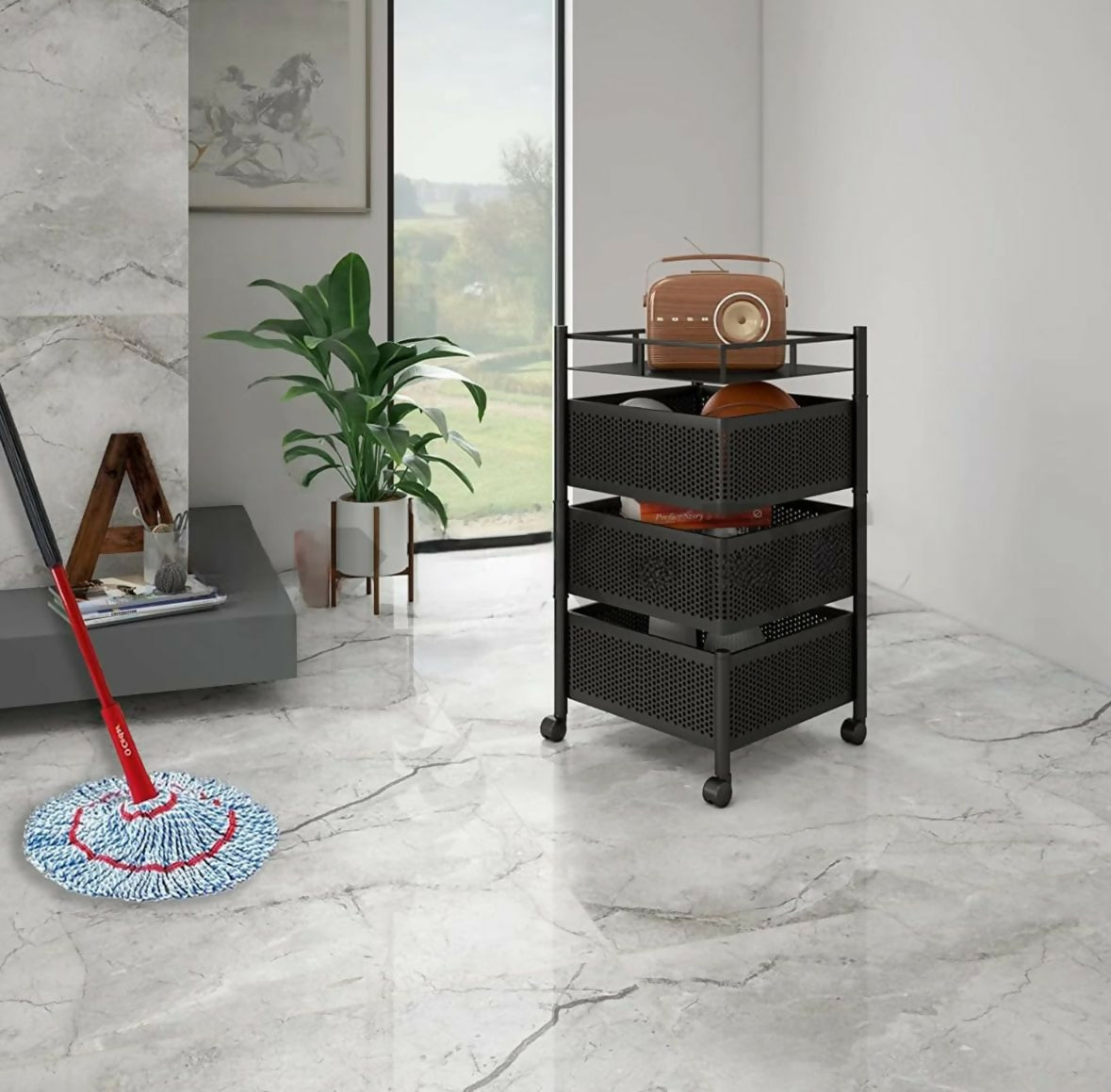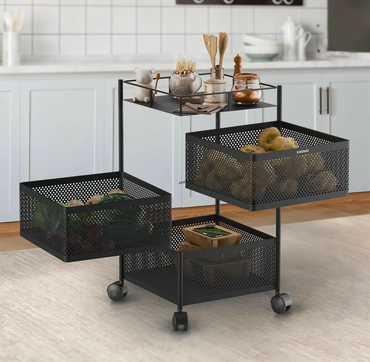 This compact square trolley offers three ventilated stainless steel baskets to store fruits, vegetables or pantry items while promoting airflow. Its rust-resistant frame and four smooth-rolling wheels