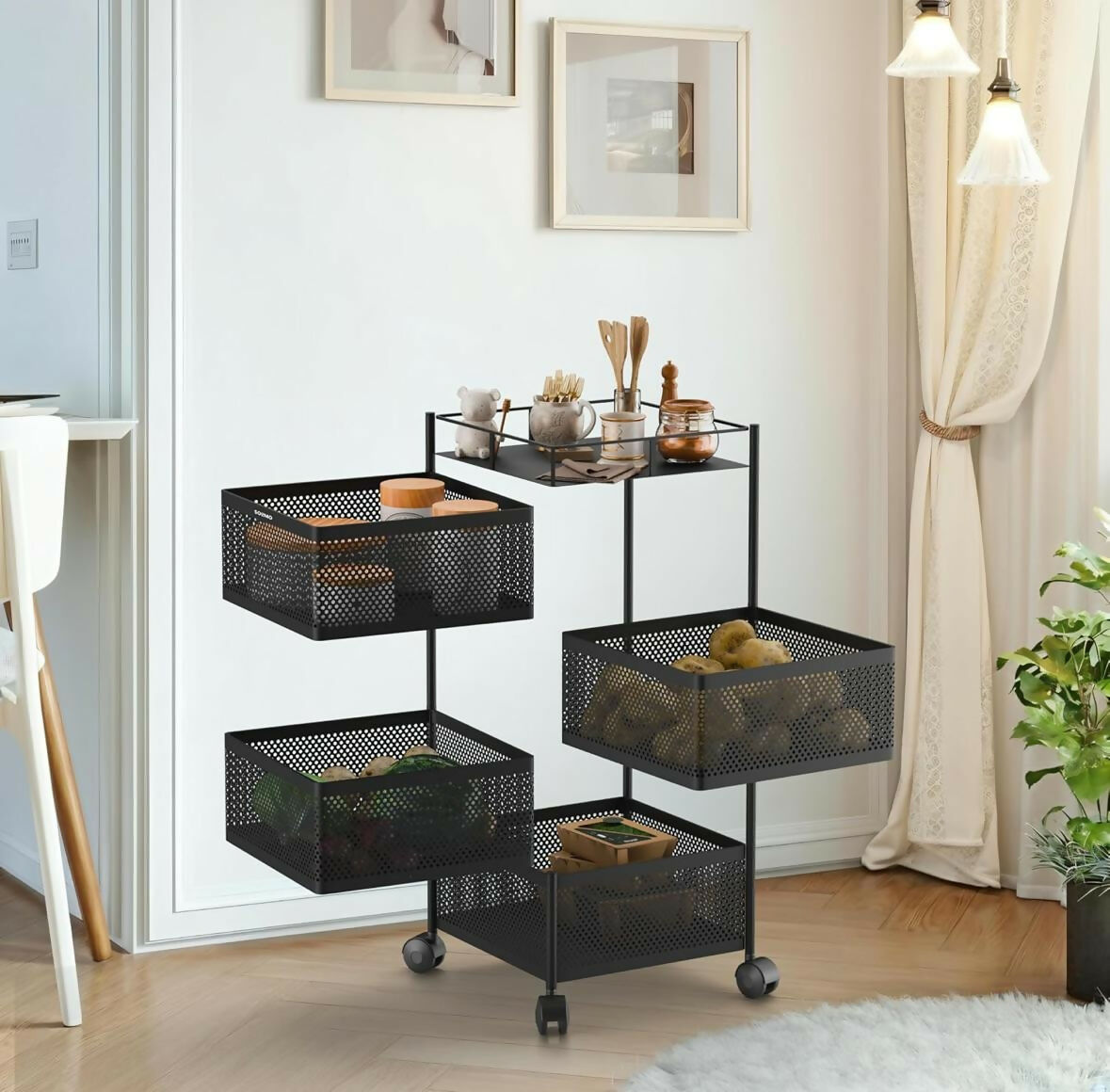Maximize small‐kitchen storage with this square stainless steel cart. Four ventilated mesh baskets keep fruits, vegetables and pantry items fresh and visible, while the rust-resistant frame and 360° swivel wheels let you glide it effortlessly into tight corners.
