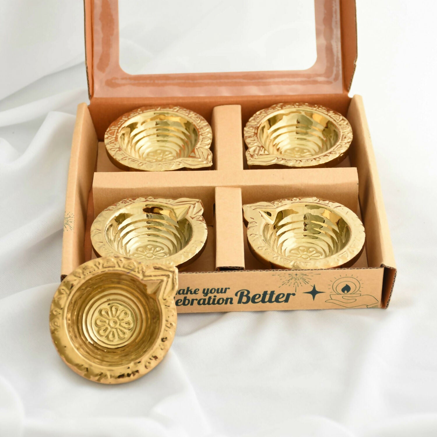 Traditional Engraved Decorative Ceramic Diya with Gold PVD Plating & Antique Metallic Finish (4 Pc)